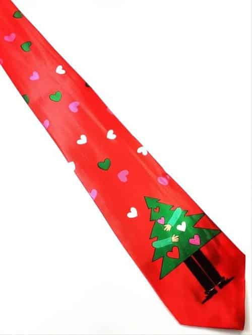 Mand krammer juletræ – juleslipsGør julen endnu sjovere med dette festlige røde juleslips i 100% polyester, perfekt til både julefrokoster, firmaarrangementer og hyggelige familiefester. Slipset har et livligt og humoristisk design med farvede hjerter sam