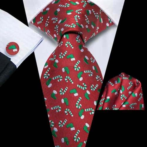 Rødt julesæt med julesokker og slikstokkeTilføj et friskt, festligt og stilfuldt twist til julens garderobe med dette eksklusive julesæt bestående af slips, dobbeltsidet lommeklud og matchende manchetknapper. Slipset er fremstillet i 100% håndlavet silke
